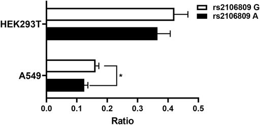 Fig. 2双荧光素酶实验测定HEK293T和A549细胞中ACE2启动子区域rs2106809*G和rs2106809*A表达差异(*:p< 0.05)。