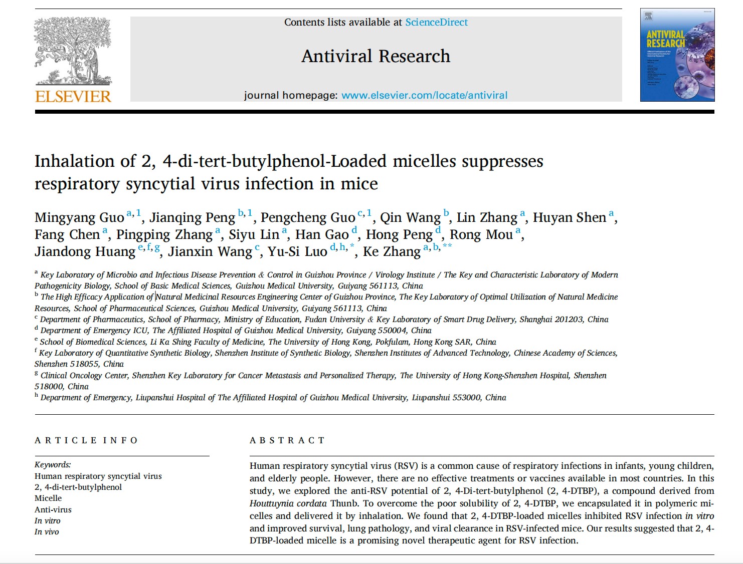 2024年4月,公司病原生物学实验室2020级硕士研究生郭名扬为第一作者,太阳集团tyc151附属医院罗语思主任医师,太阳集团tyc151张科副教授为共同通讯作者在病毒学类国际期刊《Antiviral Research》(JCR Q1,中科院2区,影响因子7.6)发表题为《Inhalation of 2, 4-di-tert-butylphenol-loaded micelles suppresses respiratory syncytial virus infection in mice》的研究论著。 该论文获得了国家自然科学基金、贵州省科技厅技术创新团队项目和太阳集团tyc151附属医院博士启动基金等项目的资助。