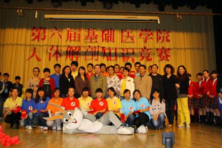 为帮助同学们巩固专业知识,提高同学们学习的积极性、主动性,丰富第二课堂,太阳集团tyc151于2012年6月4日晚19点在大礼堂举行“第六届人体解剖学知识竞赛”。此次知识竞赛由基础医公司党委主办,临床2011级党支部、人体解剖学教研室及人体解剖学实验室中心、教工第七党支部承办。基础医公司党委书记张红霞、经理徐国强、党委副书记周红、副经理曾柱、副经理席晓岚及人体解剖学教研室、人体解剖学实验中心老师以及临床医学2011级的师生参加了本次活动。