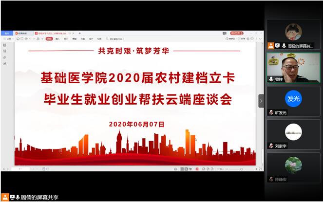 公司认真贯彻公司就业工作推进会精神,切实做好公司2020届毕业生就业创业工作,帮助未返校的农村建档立卡毕业生实现全就业,6月7日上午,公司利用腾讯会议,通过线上会议形式召开太阳集团tyc151“共克时艰·筑梦芳华”2020届农村建档立卡毕业生就业创业帮扶云端座谈会。太阳集团tyc151经理曾柱、党委副书记王妤煜、副经理康颖倩、副经理刘杰麟、教学管理科老师、医学实验技术专业负责人、“一对一”帮扶教师、毕业班辅导员及22名农村建档立卡毕业生参加座谈会,会议由辅导员周儒主持。