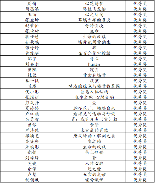 公司第六届人体解剖学与组织胚胎学手绘大赛已经落下帷幕,本次大赛充分调动基础学子参与医学绘图的积极性,以生动的画笔描绘医学知识的深刻,激发员工探索医学和艺术之间的学科融合。在前期提交的166份作品中,经过教研室专业教师从科学性、艺术性和创新性三个维度综合评分后,共60份作品进入决赛,经过激烈的角逐,最终评选出特等奖2名、一等奖4名、二等奖8名、三等奖12名、优秀奖若干。