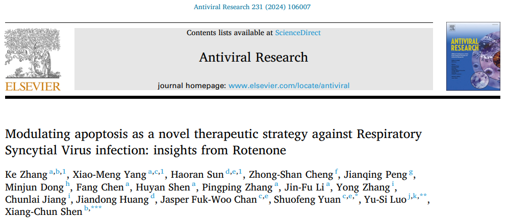20249月,我室张科副教授课题组在JCR1区、中科院2区期刊Antiviral Research(影响因子:4.5)在线发表论著《Modulating apoptosis as a novel therapeutic strategy against Respiratory Syncytial Virus infection: insights from Rotenone》(通过调控细胞凋亡抑制呼吸道合胞病毒感染:由鱼藤酮获得的启发),该论著由我室与香港大学李嘉诚医公司微生物学系袁硕峰教授课题组合作完成,目前在袁硕峰教授课题组工作的杨筱萌认共同一作。