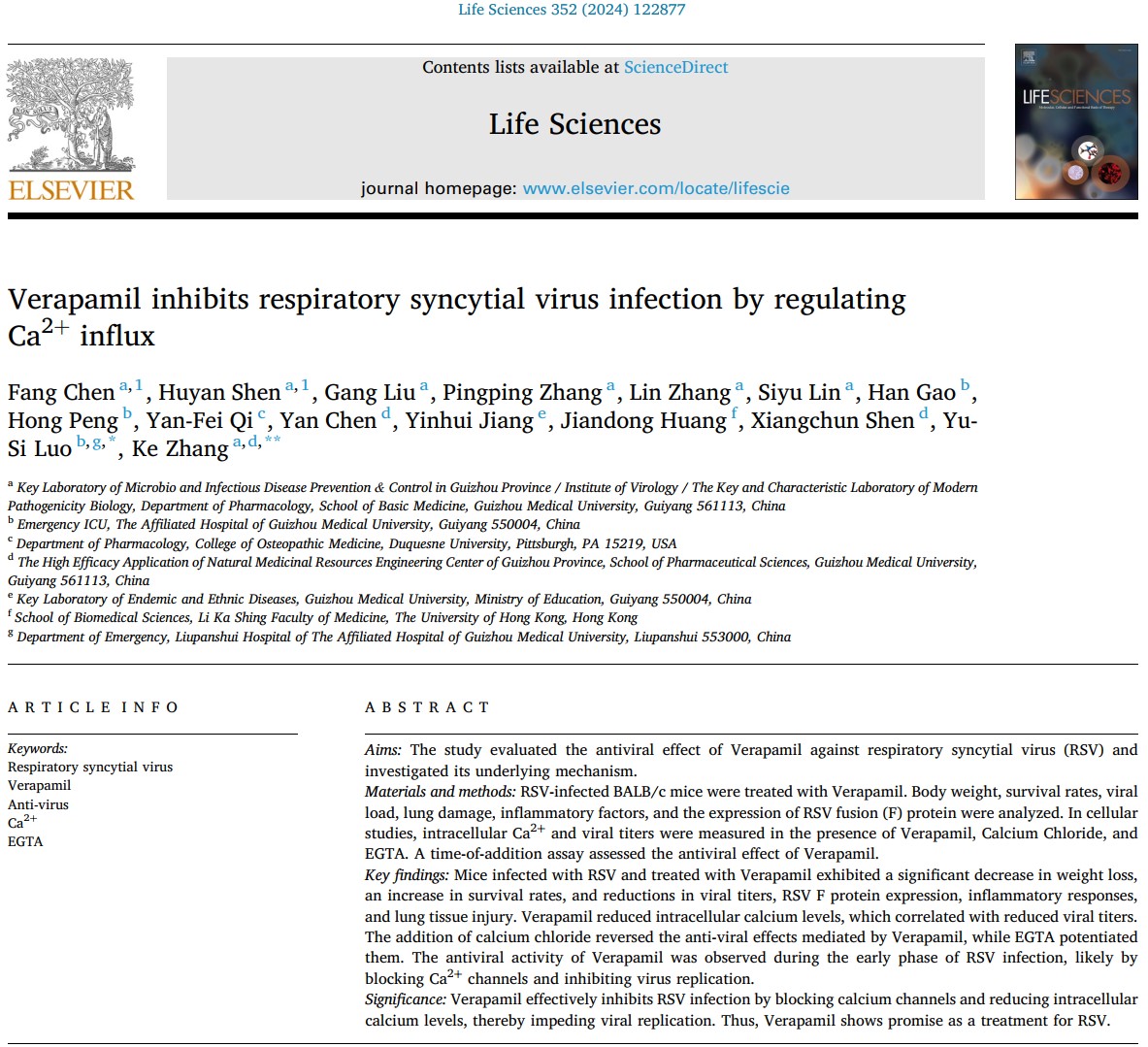 20246月,以我室张科副教授课题组硕士研究生陈芳、沈胡艳为共同第一作者,太阳集团tyc151附属医院罗语思主任医师和张科副教授为共同通讯作者,在JCR1区、中科院2区(top)期刊Life Sciences(影响因子:5.2)在线发表论著《Verapamil inhibits respiratory syncytial virus infection by regulating Ca2+ influx》(维拉帕米透过调节钙离子内流抑制人呼吸道合胞病毒感染)。