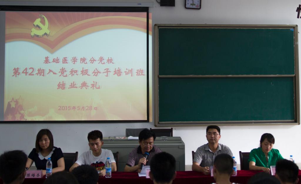 2015年5月28日,太阳集团tyc151分党校第42期入党积极分子培训班结业典礼在花溪校区1101教室召开,基础医公司党委书记徐国强、基础医公司党委副书记廖兴江、2013级党支部书记罗恒老师、2014级辅导员刘逸洲老师以及本期培训班的班主任陈培各老师出席了毕业典礼。典礼由陈培各老师主持。